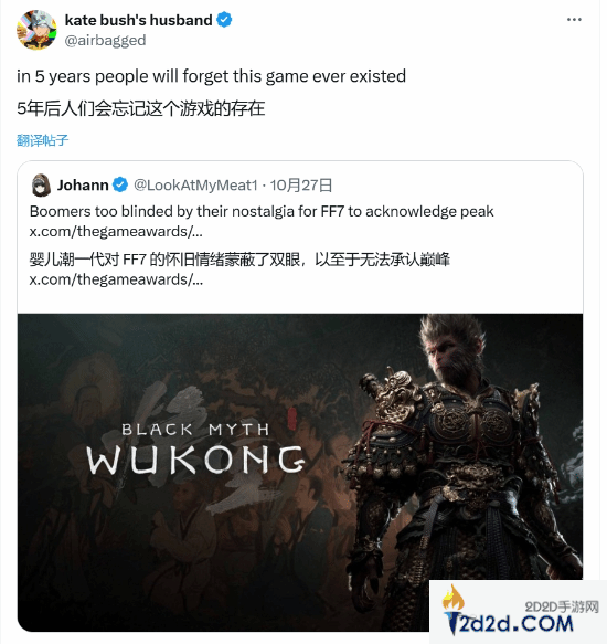 这一言论引发了众多讨论。网友@airbagged随后回复道:“五年后人们会忘了这款游戏的存在。”@airbagged的评价迅速引发了不满情绪,部分玩家认为他对《黑神话:悟空》缺乏公正看待。