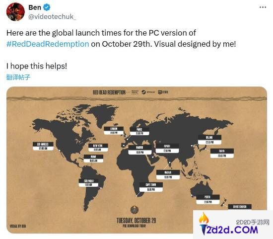 《荒野大镖客:救赎》PC版将在今日晚些时候正式发售,推主@videotechuk_自制了一张全球解锁时间图,本作在Steam国区将于北京时间晚上10点正式解锁。游戏支持简体中文界面、字幕,售价249元。