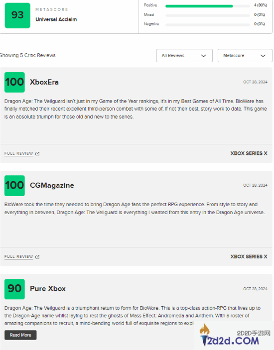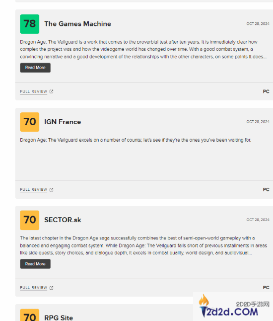 BioWare新作《龙腾世纪:影障守护者》媒体评分现已解禁,但不同平台的均分相差较大,最高的Xbox平台不乏满分评价,但最低的PC平台则有不少70分以下的中评。