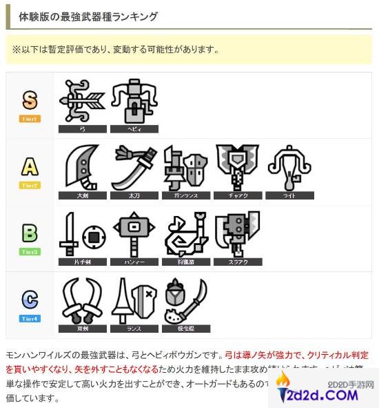 《怪物猎人:荒野》近日在PS+开启了抢先公测,日本游戏攻略网站Game With评估了目前的武器强度并列出排行榜,其中弓和重弩排在S级最强位置。两种武器都是高输出,而且重弩操作简单防御力也不错。