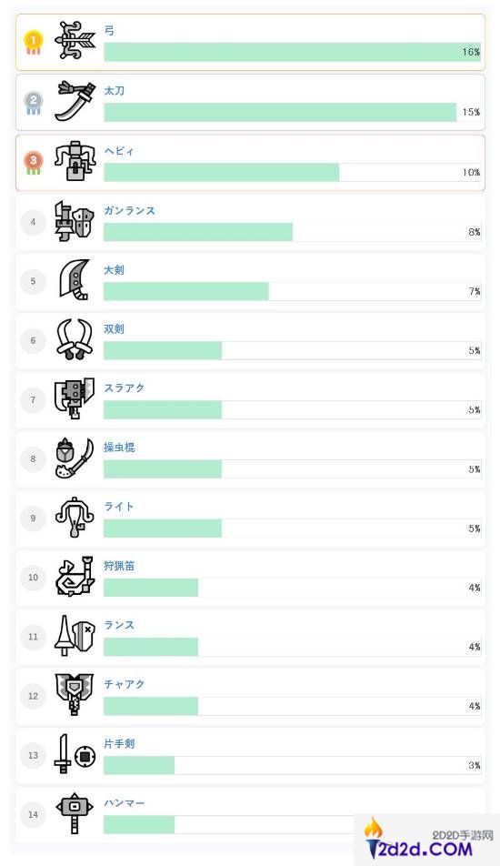 而在玩家投票的最强武器排行榜中,前三名则分别是弓、太刀和重弩,目前大锤垫底。