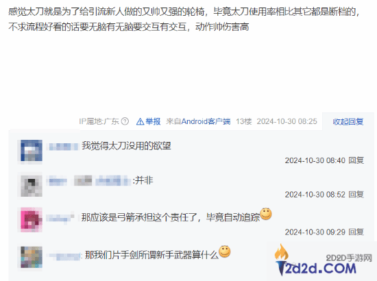 不过也有玩家表示:“太刀就是为了给引流新人做的又帅又强的轮椅,毕竟使用率是断档级的。”下方有片手剑玩家吐槽:“那我们片手剑所谓新手武器算什么?”