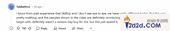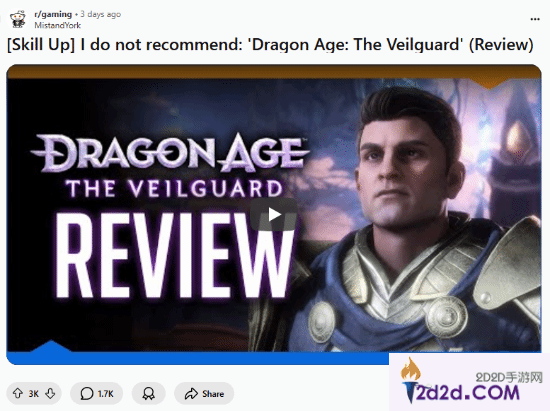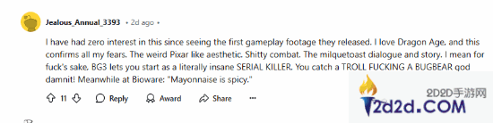 有玩家将这篇评测视频转到Reddit论坛后,随即引发玩家热议。一些玩家纷纷表示:“(游戏里)那些角色丑陋的要命!”“BioWare已经名存实亡了,《龙腾世纪:审判》也是一款节奏糟糕且无聊的游戏,但《龙腾世纪4:影障守护者》更加糟糕。”“我一开始就没抱太大希望,肯定不会在发售当天就购买《龙腾世纪4:影障守护者》,Skill Up的评测算是彻底让我决定了。”