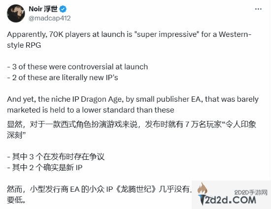 外网博主@madcap412近日对《龙腾世纪4:影障守护者》的首发Steam在线玩家数进行了评论,质疑游戏行业的评价标准。他提到,该游戏在首发时Steam上有7万的同时在线玩家,在西方角色扮演游戏中被视为“非常令人印象深刻”的成绩。