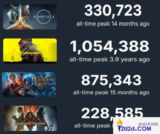 然而,@madcap412随后对比了其他热门游戏的在线玩家峰值数据,包括《星空》(330723人)、《赛博朋克2077》(1054388人)、《博德之门3》(875343人)和《龙之信条2》(228585人),这些游戏的在线玩家峰值都明显高于《龙腾世纪4》,其中有三款在发布时引发了争议,且有两款为全新IP。