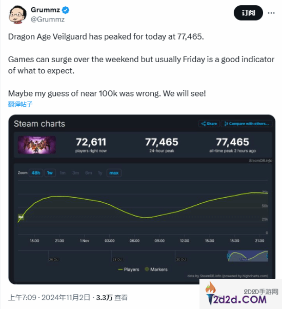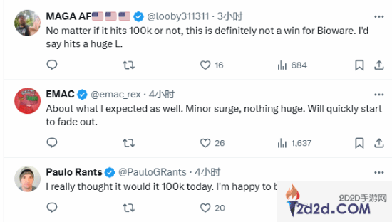日前,前暴雪制作人@Grummz转发了这一则消息,引发玩家热议。尽管峰值人数较此前有所上升,但由于游戏比较“觉醒”,大量的玩家还是对《龙腾世纪4:影障守护者》表示不满:“我现在可以肯定地说,这款游戏是商业上的失败。”“无论(玩家人数)能否达到10万,这对于生软来说也不属于什么胜利了。”“我以为今天会达到10万,我很高兴自己的预判出错。”