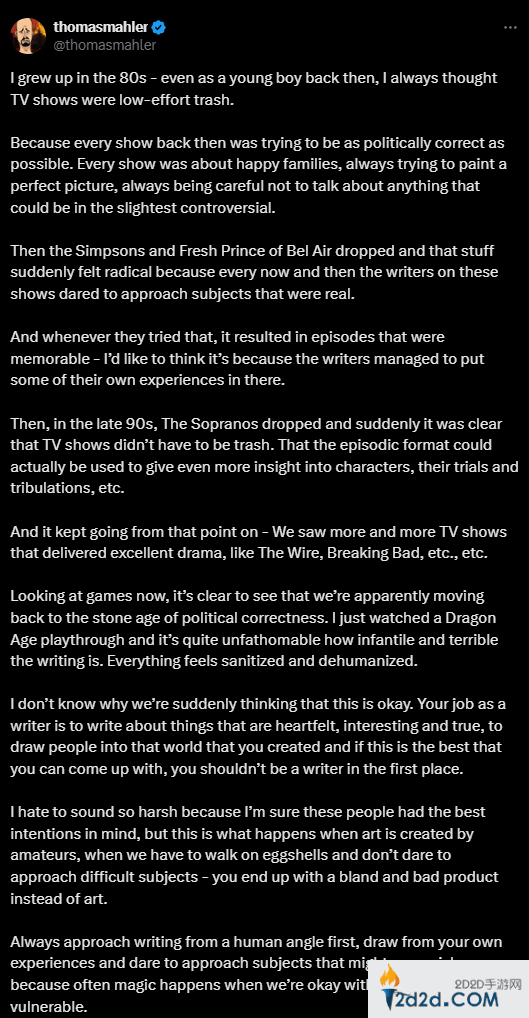 马勒表示,现在的游戏回到了像是冷战后期美国电视节目一片ZZZQ的时代,《龙腾世纪》新作剧情显得幼稚与糟糕,一切都让人感觉被人美化了。而作为一位创作者,应当“写一些真挚、有趣和真实的东西”才有资格“把人们吸引到你创造的那个世界中。”