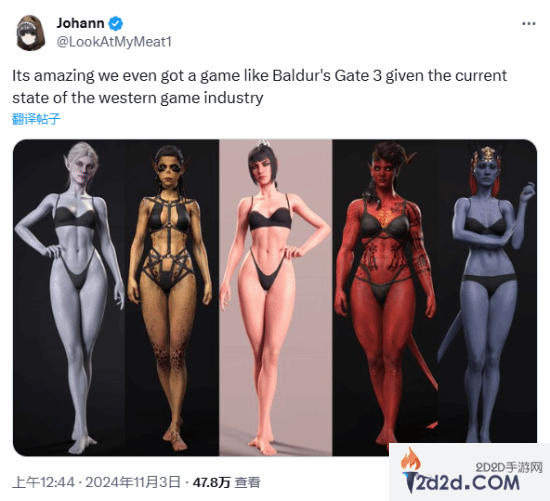 近年来,游戏界里DEI之风盛行,很多游戏里的角色都被这股风潮所影响,导致角色在相貌和身材等方面的观感不佳,让众多玩家不满。日前,推主LookAtMyMeat1晒出了《博德之门3》里一些角色的内衣图,并感慨道:“考虑到西方游戏产业的现状,我们居然能有像《博德之门3》这样的游戏,真是太棒了。”