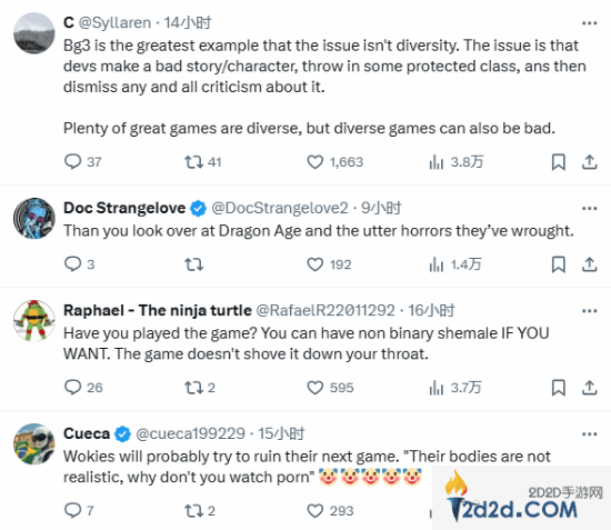 推文随即引发玩家热议,有玩家给出了公正的看法,认为问题不在于多样性,而是在于开发者的想法。还有玩家以龙腾世纪的角色为例说道:“之后你再看看它所造成的恐怖局面。”