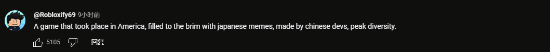 评论区也有不少国外玩家对《昭和米国物语》展示出浓厚的兴趣,有人表示:“这是一款以美国为背景、充满日本梗、由中国开发者开发的游戏,多样性达到了顶峰。”还有玩家指出:“这款游戏刻意回避了考证,没有做任何研究来确保这款游戏历史准确性,大部分都是出于刻板印象,完美的反DEI游戏。”“中国开发者的想法是对的。制作纯粹有趣游戏,不用担心冒犯任何人或避免刻板印象。只要制作畅销的游戏就行。”