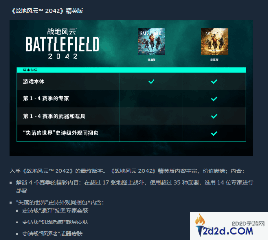 EA的《战地2042》现已在Steam平台开展特价促销活动,国区标准版仅需19.84元,《战地2042》精英版为83.6元,促销截止日期为11月12日,精英版包括游戏本体、第1-4赛季的专家、第1-4赛季的武器和载具以及“失落的世界”史诗级外观同捆包,感兴趣的玩家可以点击下方链接查看。