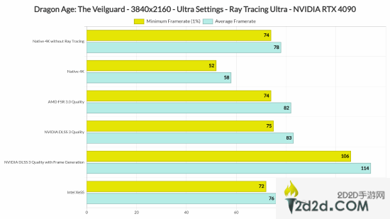 外媒dsogaming发布了《龙腾世纪4:影障守护者》的基准测试报告。该游戏采用Frostbite引擎,支持光线追踪、NVIDIA DLSS 3、AMD FSR 3.0以及Intel XeSS。为此,dsogaming决定在4K分辨率下进行性能基准测试。