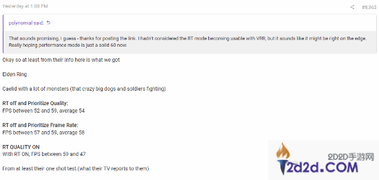 这位玩家用游戏内的区域盖利德进行了测试,结果发现,在关闭光追+质量优先设置下的帧数为52帧至59帧之间,平均为54帧;在关闭光追+帧率优先设置下的帧数为57帧至59帧之间,平均为58帧;在开启光追质量模式设置下的帧数为47帧至59帧之间。