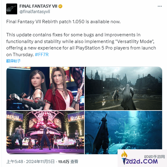 《最终幻想7:重生》官方今日宣布推出了1.050补丁。本次更新主要修复了一些问题,并对游戏功能和稳定性进行了改进。