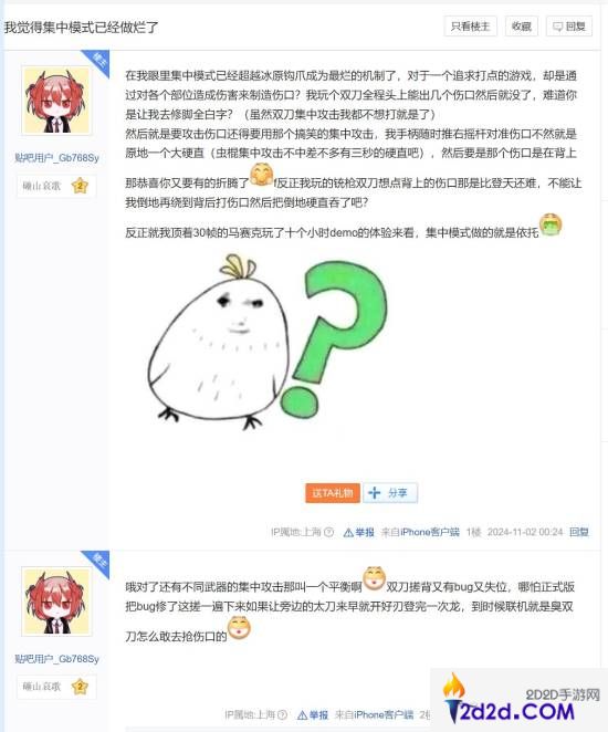 有玩家发帖表示,游戏的“集中模式”这一设计非常不平衡,不同武器想通过这一方式攻击伤口简直云泥之别,尤其是双刀“想点背上的伤口那是比登天还难”。