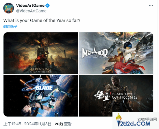 近日,外网博主@VideoArtGame在社交平台发文,向网友们询问:“你今年的年度游戏是什么?”这一话题迅速吸引了大量玩家和游戏爱好者的关注。