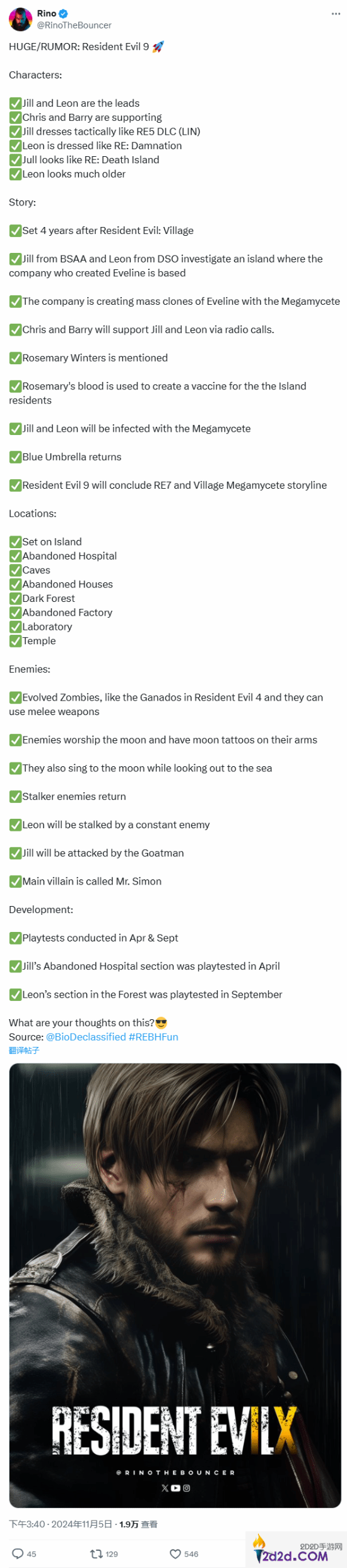 在10月份,M站上线了《生化危机9》的专属评分页面,引来了不少玩家的关注,玩家们对《生化危机9》充满了期待。11月5日,推主RinoTheBouncer汇总了关于《生化危机9》的详细传闻细节内容,涉及人物、剧情、场景以及敌人等方面,一起来看下。