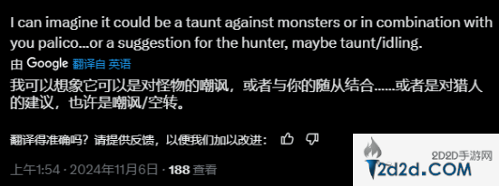 有玩家尝试猜测这段动画的用途:“这看起来像是对怪物的嘲讽,或是吸引猎人来骑乘......”