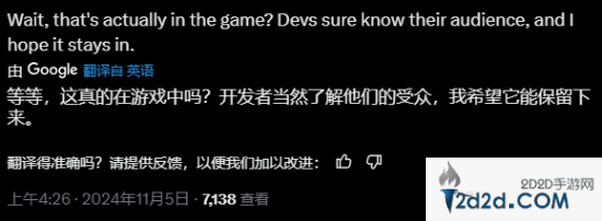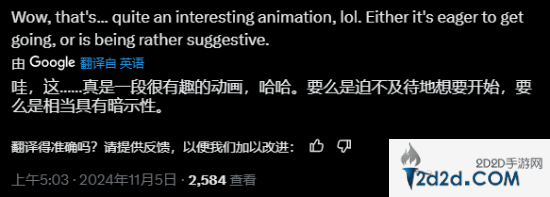 不少玩家都对这段动画赞不绝口:“制作组也太懂他们的受众了!我希望它能保留下来。”“真是一段很有趣的动画。相当具有暗示性。”