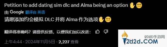 此外有玩家申请在DLC中添加约会模拟模式,并且将阿尔玛设定为攻略对象。