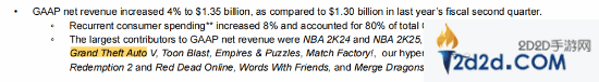 就在近日,R星母公司Take-Two公布了2025财年第二季度(2024年4月至9月)的最新财报。财报中显示,本季度公司销售额为14.7亿美元,同比增长2%。对公司净收入贡献最大的是《NBA2K25》、《NBA2K24》、《GTA OL》、《GTA5》等游戏。