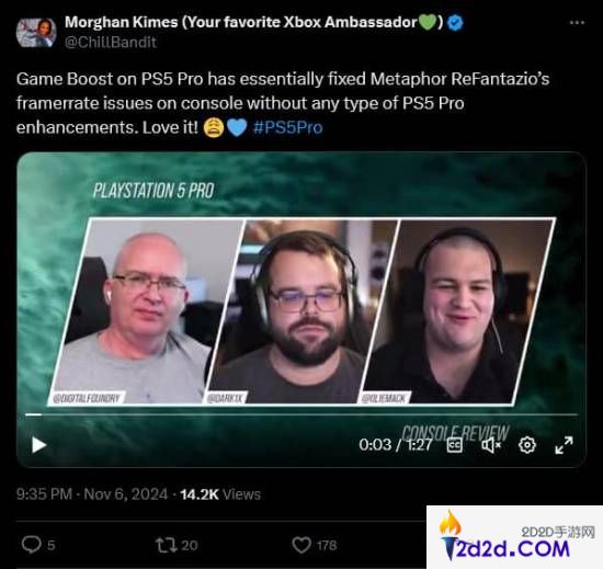 在PS5 Pro发售之后,Digital Foundry再度对其进行了测试,结果显示,即使游戏没有推出任何针对PS5 Pro的补丁。《暗喻幻想:ReFantazio》在PS5 Pro也能保持稳定的60帧,这要归功于PS5 Pro的Game Boost功能,该功能可以“增强”所有旧游戏(主要是为PS4制作的游戏)。