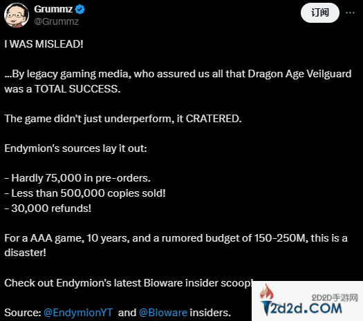 《龙腾世纪4》预购量不足 75000 份;销量不足 500000 份;超3万人退款。