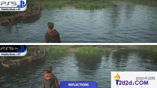 从视频中可以看到,游戏在PS5 PRO上运行时,角色建模,场景纹路等相较于PS5原版都更加细致,主角脸上的雀斑都清晰可见。此外,水面倒影也更加显得更加真实,光线追踪性能显著提高。
