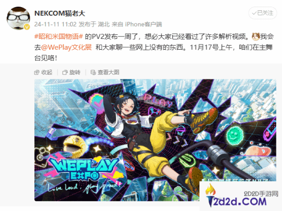 11月11日,铃空游戏CEO、《昭和米国物语》创意总监、制作总指挥猫老大在微博表示:“《昭和米国物语》的PV2发布一周了,想必大家已经看过了许多解析视频,我会去WePlay文化展和大家聊一些网上没有的东西。11月17号上午,咱们在主舞台见!”据悉,今年的WePlay文化展将于11月16日至17日在上海世博展览馆举办。
