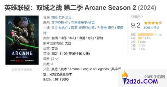《英雄联盟》动画剧集《双城之战》第二季不久前开播,今日下午剧集在豆瓣正式开分,拿下9.2分的超高评价。