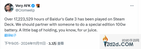 拉瑞安发行总监今日宣布:《博德之门3》在Steam掌机上的总游戏时间已经超过1700万小时!