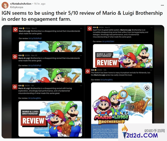 近日,一位Reddit网友发文批评IGN,认为IGN故意宣扬自己为《马里奥路易吉RPG:兄弟齐航》打了5分的低评分来吸引点击。该网友在帖子中附上了一张截图,内容为IGN在最近几天发布了数条有关《马里奥路易吉RPG:兄弟齐航》IGN5分的推文。