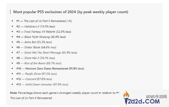 TrueTrophies汇总了350万PSN账户的游戏数据,发现在今年推出的13款PS5独占(还登陆了PC)游戏中,《地平线:零之曙光 重制版》的周玩家数量排名第10,表现不尽人意。从图表里可以看到,顽皮狗的《最后生还者2:复刻版》表现较为出色,击败了《地狱潜者2》、《最终幻想7:重生》等一系列游戏。