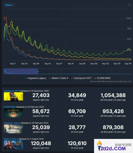 近日,博主@Pirat_Nation在社交平台分享了一张图表,展示了《赛博朋克2077》《艾尔登法环》《霍格沃茨之遗》和《博德之门3》的Steam在线玩家数量对比。该博主提出了一个问题:“为什么《博德之门3》的玩家数如此稳定高涨,甚至超越历史上任何一款游戏?”