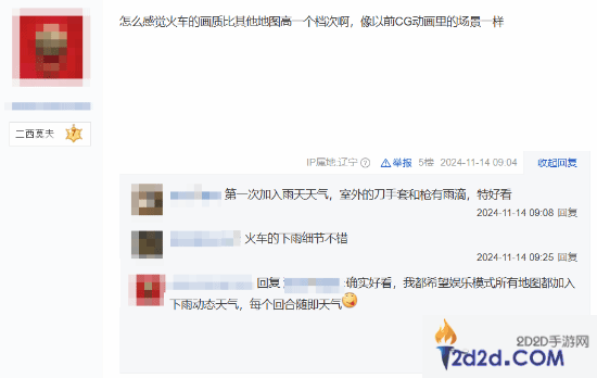 有玩家认为,下雨的列车停放站很有氛围感,用来打狙感觉特别爽。还有玩家感觉列车停放站地图的画质比其他地图观感更佳,就像以前CG动画里的场景一样。那么,你认为本次列车停放站地图的回归质量如何呢?欢迎在评论区留下你的看法。