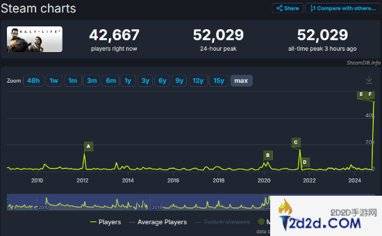 据SteamDB数据显示,本次活动带动《半条命2》Steam在线人数走向新高,以5.2万人同时在线的优秀成绩打破了此前记录(此前最高为1.6万人)。