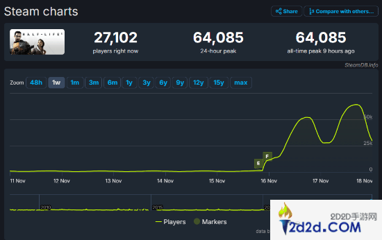 截至发稿前,据SteamDB数据显示,《半条命2》在Steam平台的玩家数量再次创下新高,达到了64085人,这对于一款已经发售了20年的游戏来说,数据十分出色。