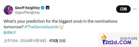 TGA 2024提名名单将在北京时间11月19日凌晨正式公布,今日TGA创始人/主持人Geoff Keighley发推预热,询问玩家:你对明天提名中最大的提名冷遇预测是什么?