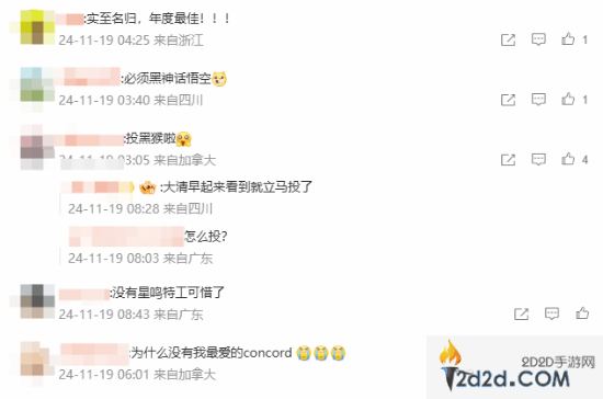 抖音TGA官方投票开启!快来为《黑神话:悟空》投票吧11月19日凌晨,TGA 2024游戏奖项提名正式公布,其中备受玩家们关注的《黑神话:悟空》获得了年度游戏大奖、最佳艺术指导奖、最佳动作游戏奖、最佳游戏指导奖四项提名,TGA在B站里的时间:2024-11-19 -
