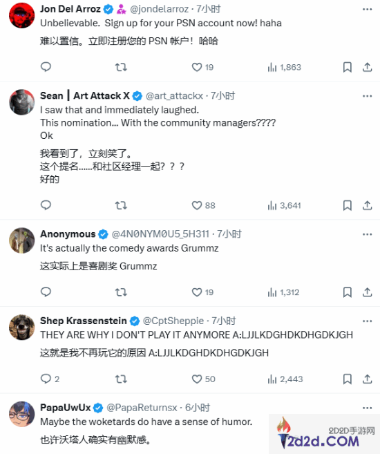 在评论区不少玩家直接绷不住笑喷了,这个提名不如叫它“最佳喜剧奖”。也有玩家调侃道,没准这是他们独有幽默感。