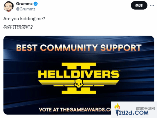 前暴雪制作人Grummz发文调侃:“你在开玩笑吧?”并配上了《地狱潜者2》获得提名的截图。