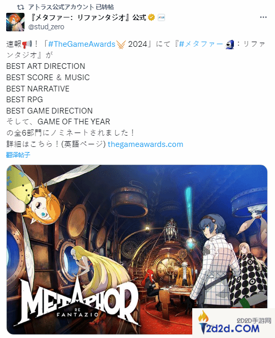 为庆祝《暗喻幻想》获得2024 TGA年度游戏、最佳艺术指导、最佳配乐/音乐、最佳RPG游戏、最佳游戏指导以及最佳叙事共六项提名,ATLUS官方分享了由角色设计师副島成記最新绘制的宣传图,一起来欣赏一下。