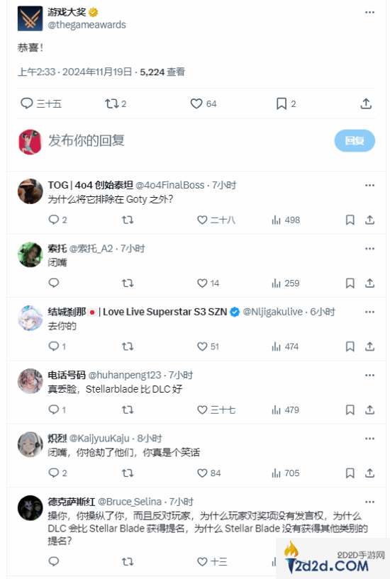 对此,游戏官方推特发文庆祝,并向玩家表达感谢,而 TGA 官方也在评论中互动回复表示祝贺。然而,TGA的回复遭到了很多玩家的抨击。