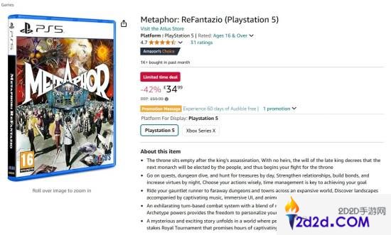 亚马逊购物平台显示,原价59.99英镑的《暗喻幻想》PS5/XSX实体光盘,“黑五”限时优惠42%直降25英镑,折后价格仅需34.99英镑(约人民币320元)。虽然国内玩家很难直接购买海外版光盘,但多少会对国内的第三方市场价格造成影响,感兴趣的玩家可以继续观望一阵。