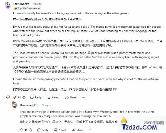 有玩家日前发帖谈到了这一点,表示:“《黑神话:悟空》未能获得最佳配乐和音乐奖的提名简直是一种耻辱。”关于原因,一些玩家认为这与《黑神话:悟空》的配乐的受众度有关,一些配乐里有着深厚的文化底蕴,不了解游戏背景的玩家很难与配乐产生共鸣,除此之外,《黑神话:悟空》的配乐还缺少令人难忘的原创旋律。也有玩家认为,《黑神话:悟空》就应该获得这项提名,因为配乐的立意非常棒。
