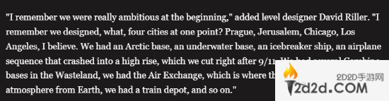 关卡设计师David Riller补充说:“我们当时的野心非常大,我记得一度设计了四座主要城市,包括布拉格、耶路撒冷、芝加哥和洛杉矶。还有极地基地、水下基地、破冰船、以及一场飞机撞入高楼的场景,但这个场景在9/11事件后被取消。我们还设计了荒原中的联合军基地、火车站等内容。”此外,纪录片中还揭示了游戏原本设定在极地冰原场景中,甚至包含了一款独特的“冰枪”。