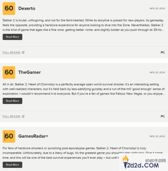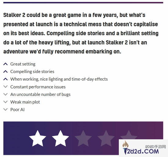 《潜行者2》IGN Adria 7分,GS给出了8分,M站均分77分,IGN本部表示由于本作性能问题过多,完整评测将在之后发布。