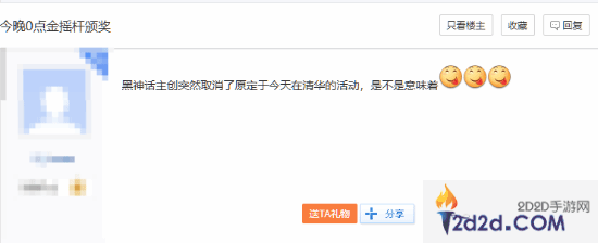 今日贴吧有网友发文表示,原定于今天下午在清华大学大礼堂举行的《黑神话》主创团队讲台突然被取消,他推测:“今晚0点金摇杆颁奖,讲座突然被取消了,这是不是意味着......”