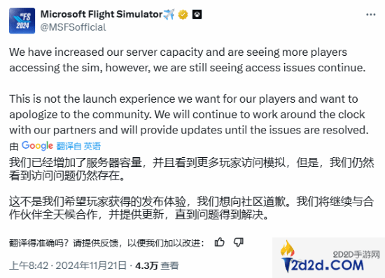 《微软飞行模拟2024》首发表现差!微软:实在太抱歉