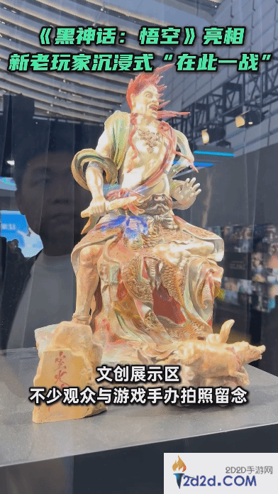 在文创展示区,也有不少观众与游戏周边、手办拍照留念,试戴紧箍咒、收集明信片,值得一提的是,除了天命人的手办雕像,视频中还展现了猪八戒的模型,还原十分到位。